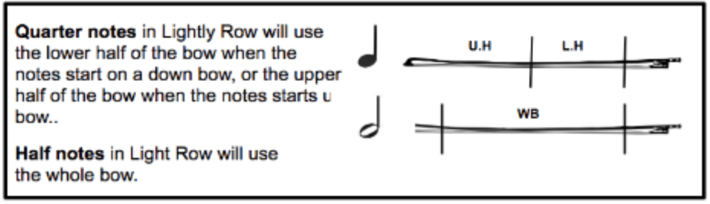 Learning how to distribute the bow is essential to phrasing and keeping a consistent tone. What’s great about Lightly Row is that the bow speed remains the same throughout (unless you are adding dynamics to the piece, see Form section).